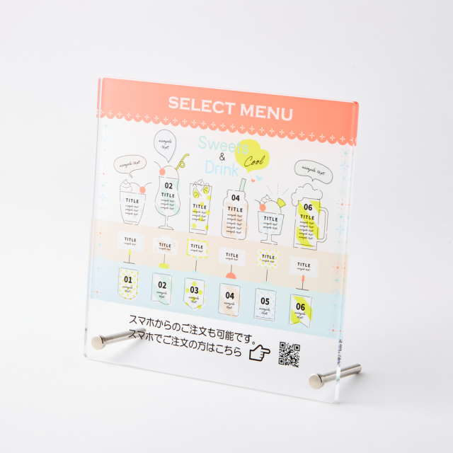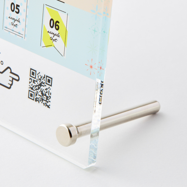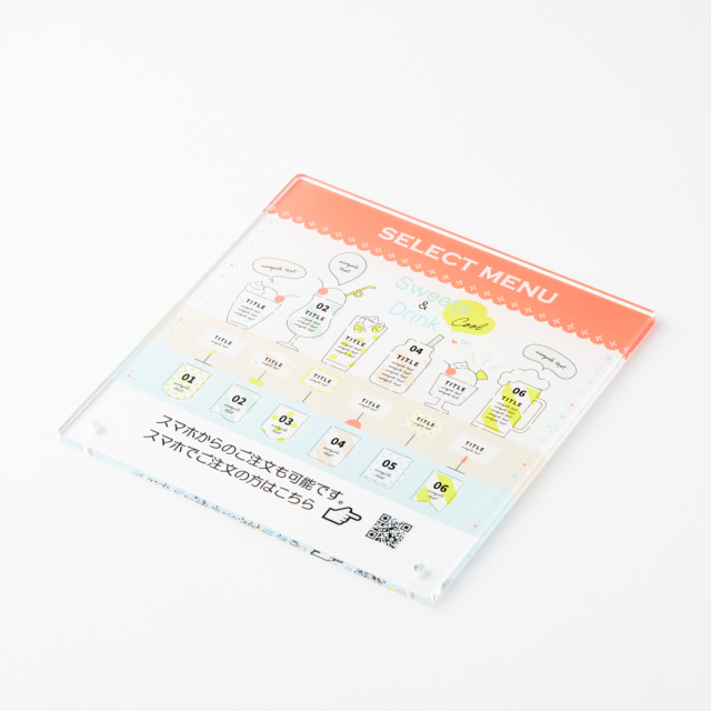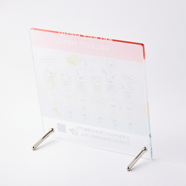 置いておけば目を留めて、会話をせずにサービスや商品を訴求できる強い味方の丁度いいサイズ感のサインボード。以前から人気はありましたが、昨今のコロナ禍では更に人気が爆上がり中!商品サイズ範囲内であればダイカット形状も対応可能で思いのままの表現が楽しめます。耐久性に優れたUVインクジェットプリントに厚さ5mmのアクリルを使用しているので、高級感のあるオリジナルPOPスタンドが製作できます。広いスペースで告知できるので、カウンターのメニューボード、サービスやキャンペーンの告知等、シチュエーションに合わせたサインボードが自由自在に製作きます。QRコードの印刷も対応可能です。(最小10mm以上推奨です)カット面は高性能レーザーを使用しているので、とてもなめらかな仕上がりになっています。